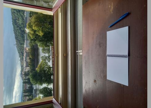 In Tschechien wird gewählt, eine starke Polizeipräsenz durchsetzt die Touristenmassen. Manche Ecken und Straßen erkenne ich von früheren Besuchen wieder. Wir schnaufen hinauf in den vierten Stock, Altbau und Parkett, ich solle mich nicht über den Gesang wundern, es befinde sich eine Musikschule im Haus, hier sei der Schlüssel. Ich rücke den kleinen Schreibtisch ans Fenster. Wo sonst könnte er stehen, als vor dieser Aussicht auf das viele Wasser der Moldau, den Buckel des Petřín, die vorbeischlendernden Touristen, von denen ich nun keiner mehr sein soll. Sondern ein vorübergehender Bewohner.